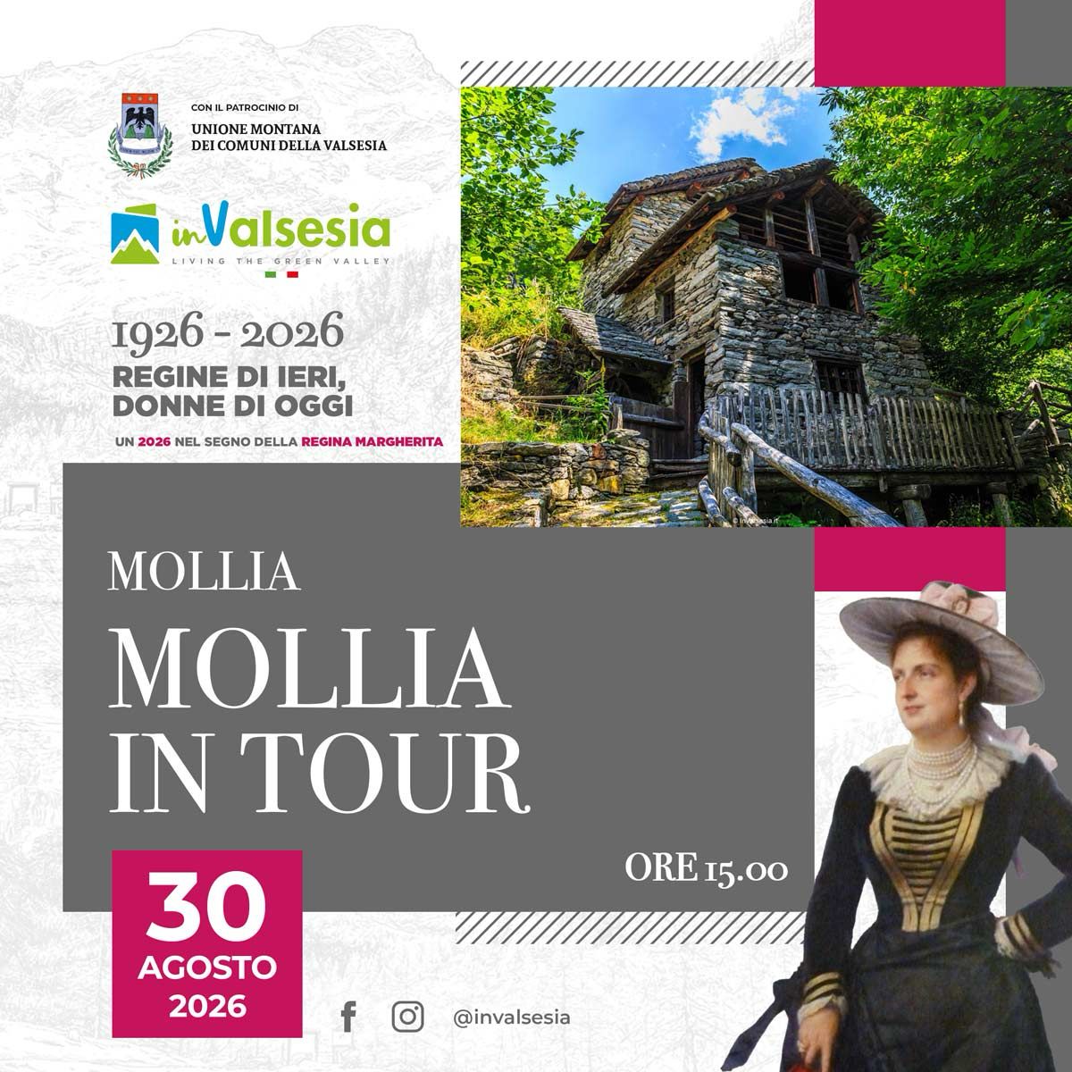 Mollia Mollia, ItalyScopri la Valsesia attraverso le Donne di oggi sulle orme delle Donne di ieri che hanno fatto la storia per il 100° della Regina Margherita
